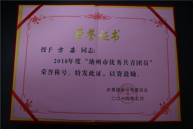 2018年度“池州市優(yōu)秀共青團(tuán)員”(方姿)