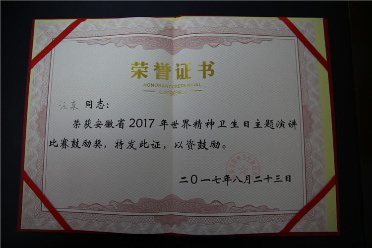 安徽省2017年世界精神衛(wèi)生日主題演講比賽鼓勵獎(汪榮)