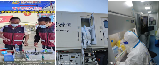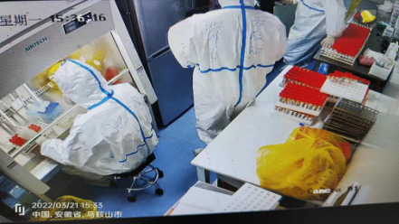 3月15日當天到達現(xiàn)場后,我們草草結(jié)束中飯,隨即立刻穿上防護服,進入實驗艙進行檢測任務(wù)。由于本單位還沒開展核酸檢測這一項目,我們抱著學(xué)習的態(tài)度,跟著隊友熟悉儀器的操作和檢測的流程。傍晚與另外一組隊員交接班時,不透氣的防護服、厚厚的N95口罩、滿是水霧的防護面屏,讓我第一次真正體會到一線抗擊疫情人員的不易。在現(xiàn)場匆匆忙忙的吃了口晚飯,我和同事立即趕往安排的賓館,整理好行李后稍作休息,這時接到出發(fā)去現(xiàn)場的指令,于是我們又馬不停蹄地趕到檢測車上,開始核酸檢測的工作。
