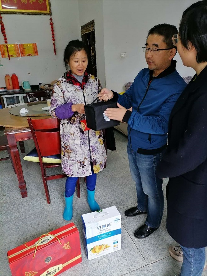 走訪中,童志禮分別和幫扶對(duì)象余德貴、余美清及其家人親切交談,詳細(xì)了解余德貴家庭因病返貧后的生活情況、病人身體恢復(fù)情況,詢問(wèn)了余美清聾啞的原因和治療的過(guò)程,對(duì)他們家庭的境況表示理解,鼓勵(lì)他們要相信黨和政府,樹(shù)立美好生活的信心,爭(zhēng)取早日脫貧。同時(shí)代表市三院對(duì)他們表示親切的慰問(wèn),為他們送去慰問(wèn)金和水果、牛奶等慰問(wèn)品。門診部還特別為余美清的大女兒贈(zèng)送了一套精美的馬克筆,激勵(lì)她努力學(xué)習(xí),勤奮上進(jìn)。
