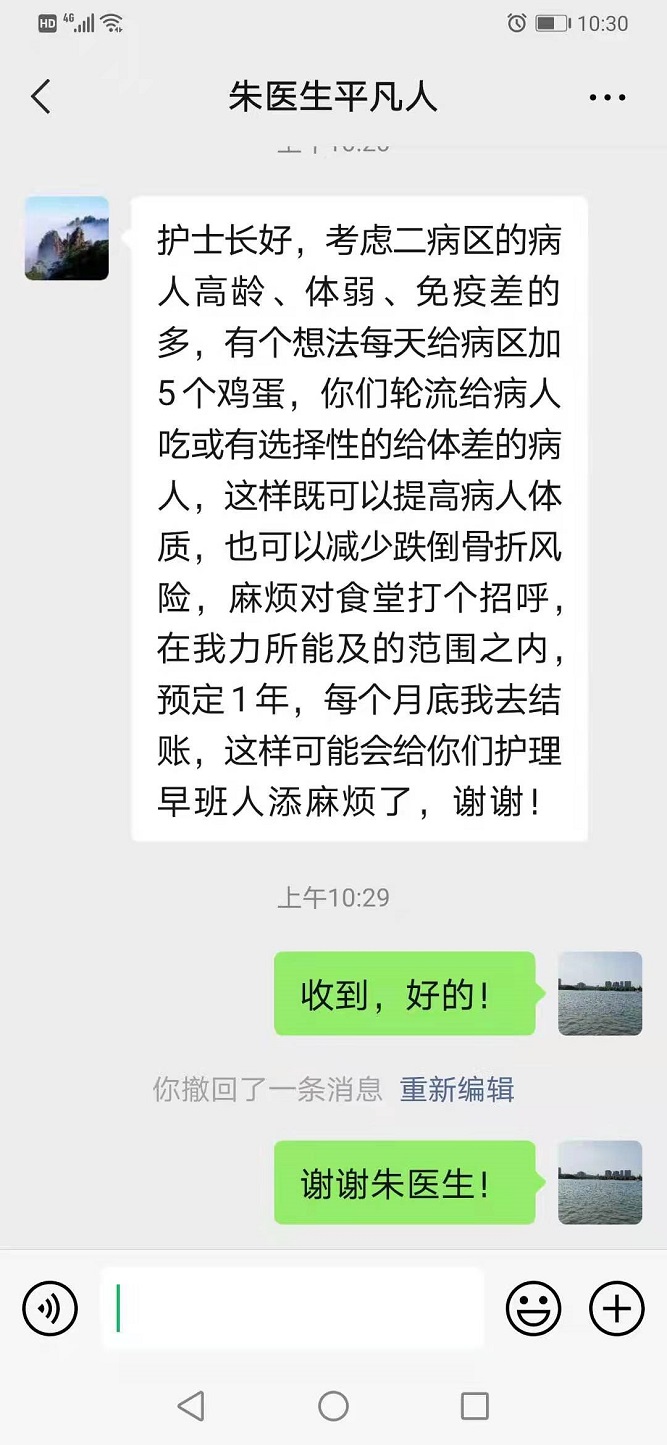 學(xué)黨史 踐行動 ——二病區(qū)朱民付醫(yī)生自費(fèi)給患者加餐一年