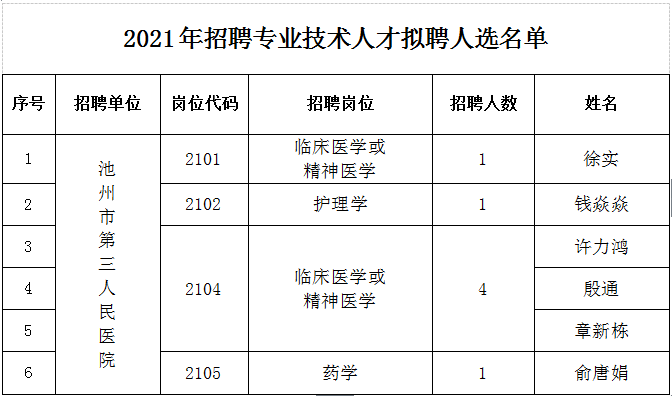 根據(jù)《池州市第三人民醫(yī)院2021年招聘專業(yè)技術(shù)人才公告》規(guī)定,經(jīng)報名、資格復(fù)審、面試、體檢、考察等程序,徐實等6名考生符合相應(yīng)招聘崗位條件,確定為擬聘人員?,F(xiàn)將擬聘人員名單予以公示,公示時間為2021年6月2日至6月8日。