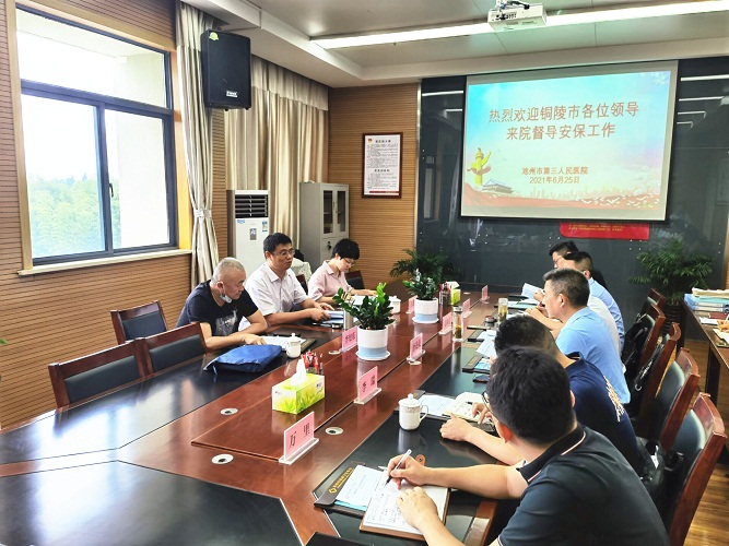 根據(jù)省衛(wèi)生健康委進一步加強醫(yī)院安保工作的重要指示,6月25日下午,銅陵市衛(wèi)生健康委副主任趙斌帶領(lǐng)委醫(yī)政科負責人王慧琴等一行3人,赴市三院督導安保工作。池州市衛(wèi)生健康委調(diào)研員章新亮,委醫(yī)鑒辦主任張錚,市公安局治安支隊李瑞、包興開,市三院黨委書記、院長唐達亮率相關(guān)職能科室人員陪同。