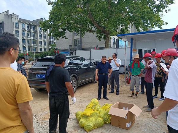 入梅以來,天氣持續(xù)悶熱高溫,但仍有不少一線勞動者堅守在崗位,經(jīng)受著嚴(yán)峻的“烤驗”?!案邷靥鞖庀?,一線工人工作強度如何?防暑降溫工作是否安排到位?”帶著滿心的關(guān)懷,7月7日下午,池州市第三人民醫(yī)院黨委書記、院長唐達(dá)亮,黨委委員宋輝攜相關(guān)科室人員,看望慰問堅守在市三院二期工程項目施工現(xiàn)場的一線工人,并為他們送去防暑降溫藥品和西瓜。