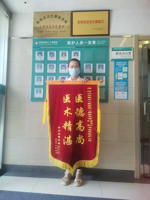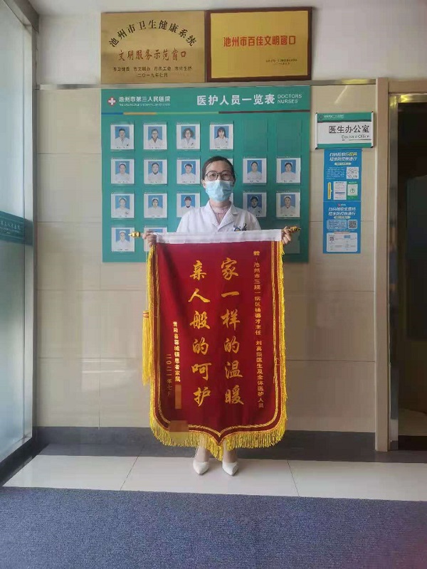 近日,市三院一病區(qū)全體醫(yī)護(hù)人員分別收到貴池區(qū)梅村鎮(zhèn)、青陽縣蓉城鎮(zhèn)患者家屬贈(zèng)送的寫著“家一樣的溫暖 親人般的呵護(hù)”和“醫(yī)德高尚 醫(yī)術(shù)精湛”的兩面錦旗,對患者住院治療期間悉心的照料表示感謝。