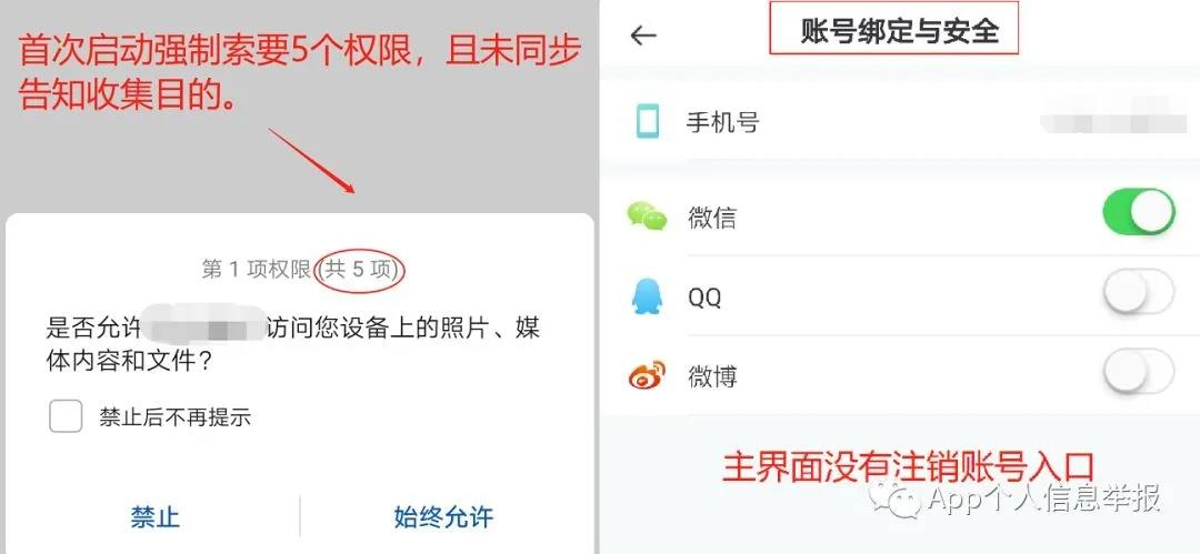 (2)75%的App首次啟動時(shí),申請可收集個人信息的權(quán)限且并未同步告知收集目的,部分權(quán)限被設(shè)置為必須提供,不允許即閃退,無法瀏覽App或使用其基本功能。甚至還有App首次啟動時(shí)一次性申請授權(quán)所有可能用到的權(quán)限,否則無法使用App。