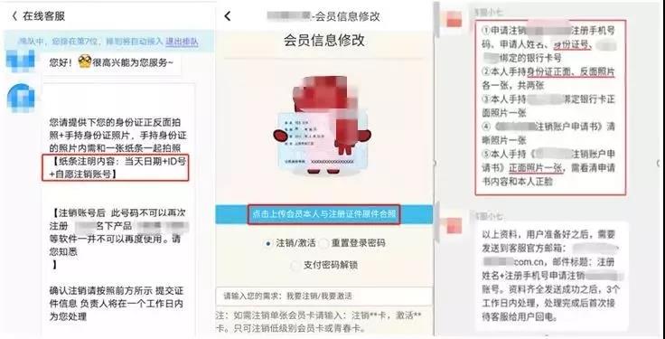 進(jìn)一步分析App中收集手持身份證照片的過程和方式,不免讓人心生很多疑問。首先,部分App對收集使用該信息的目的、使用范圍等未作明確闡釋,甚至不允許用戶添加必要的使用目的限制相關(guān)的水印;其次,從核驗身份目的而言,完全可以在完成身份核驗后及時刪除收集的手持身份證信息。但是,很多App在注銷賬戶時,要求用戶提供該信息核驗身份,但并未向用戶表明不會存儲該信息。用戶不得不吐槽,“注銷賬戶收的信息還比注冊和使用多,也更敏感,這到底是注冊還是注銷?”,最后出于擔(dān)心敏感信息被濫用,只能作罷。