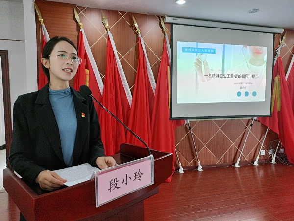 段小玲同志立足崗位實際向與會人員分享了她從事精神衛(wèi)生工作的點滴和感悟,努力用愛心、耐心、責任心去撫慰深受疾病折磨的患者,并倡導大家要重視心理健康,關心關愛精神疾病患者,消除偏見與歧視,力爭為精神疾病患者及家屬營造尊重、接納、關愛的良好社會氛圍,展示了精神衛(wèi)生工作者醫(yī)者仁心的大愛情懷。