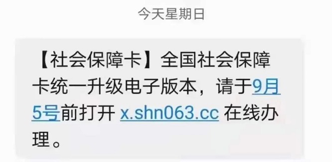 “【社會保障卡】全國社會保障卡統(tǒng)一升級電子版,請于x月x號前打開xxxxxxx(網(wǎng)址)在線辦理?!?/span>