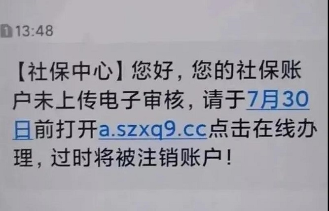 “您好,您的社保賬戶未上傳電子審核,請于XX月XX日前打開點擊X.XXXXX.XX(網(wǎng)站)在線辦理,過時將被注銷賬戶!”