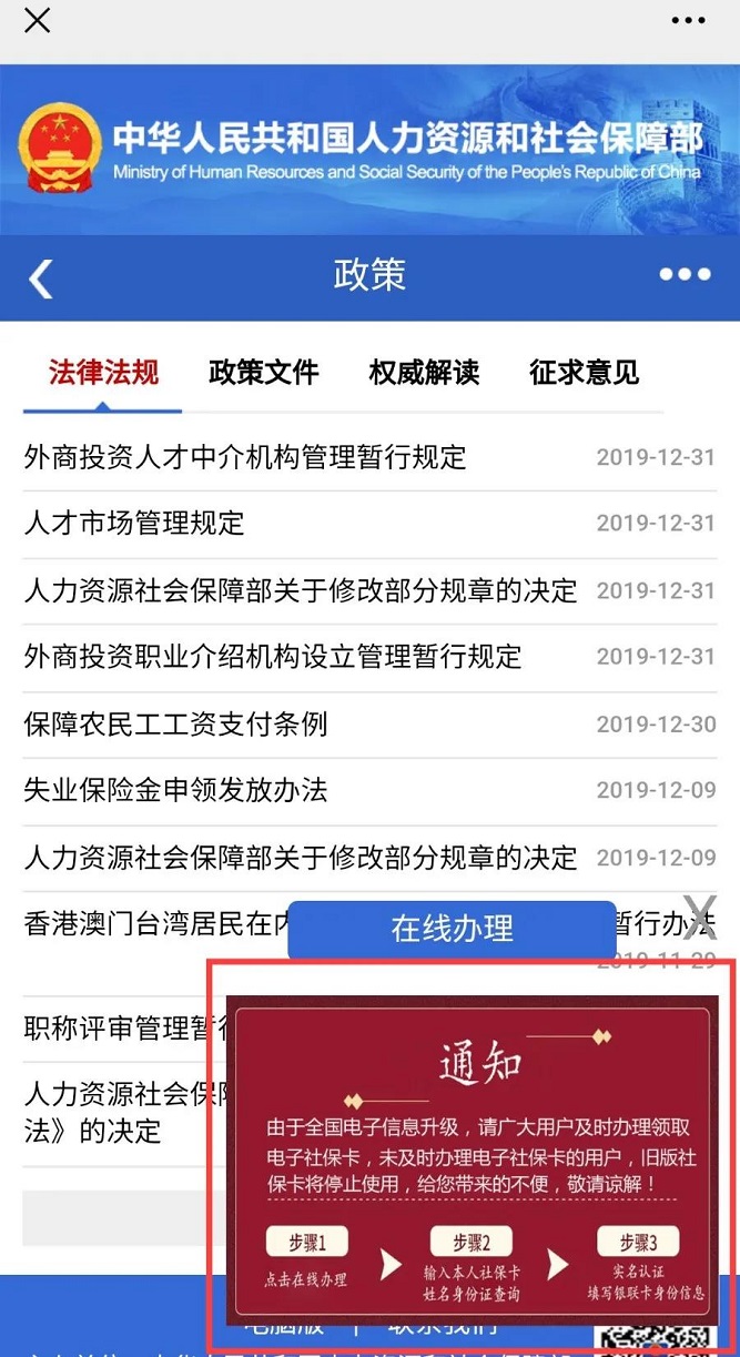 特別提示:人社部門發(fā)送的社??ㄞk卡(電子社??ㄉ觐I(lǐng))短信,不會附加任何不明網(wǎng)址,推送的短信不需要輸入任何涉及個人信息、金融賬號等私密信息。