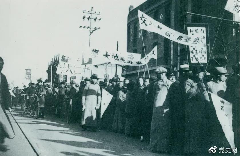 1935年12月9日,中國共產(chǎn)黨領(lǐng)導(dǎo)北平學(xué)生掀起聲勢(shì)浩大的抗日救亡運(yùn)動(dòng),并迅速波及全國,形成抗日救國的新高潮。圖為游行隊(duì)伍。