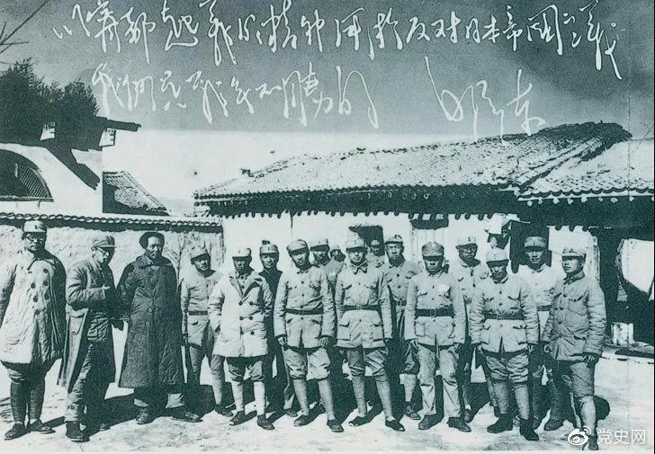 1931年12月14日,國(guó)民黨第二十六路軍在趙博生、董振堂、季振同、黃中岳率領(lǐng)下,于江西寧都起義,加入工農(nóng)紅軍,編為紅軍第五軍團(tuán)。圖為1937年毛澤東、王稼祥、蕭勁光與寧都起義的參加者在延安合影。