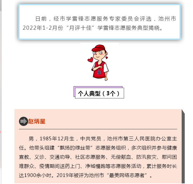 市三院趙炳星榮獲池州市1-2月份“月評十佳”學(xué)雷鋒志愿服務(wù)典型