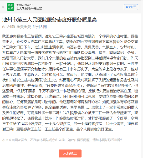 近日,池州人網(wǎng)一篇《池州市第三人民醫(yī)院服務(wù)態(tài)度好服務(wù)質(zhì)量高》的文章引起大家共鳴,作者以到市三院治療睡眠問題的親身經(jīng)歷,充分贊譽了醫(yī)院的環(huán)境衛(wèi)生、服務(wù)態(tài)度、診療水平、管理能力等。
