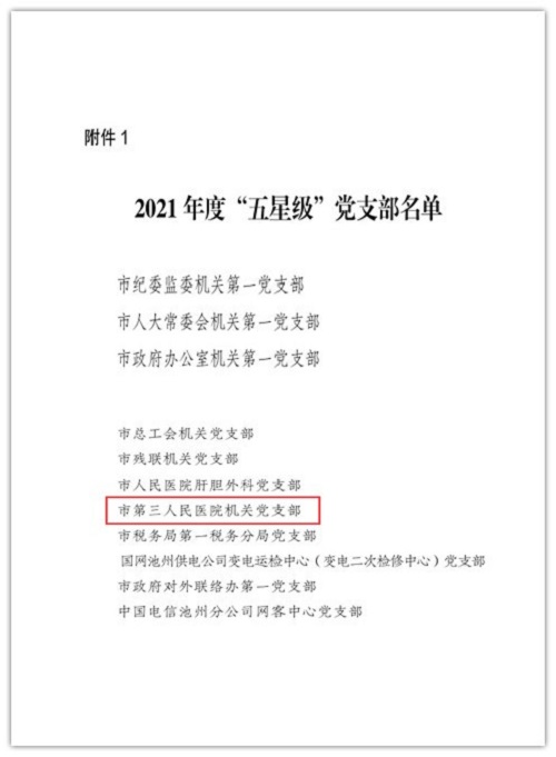 3月29日,從剛剛召開的池州市“2021年度黨組(黨委)書記抓基層黨建述職評議會暨2022年度市直機(jī)關(guān)黨的建設(shè)工作會議”上獲悉,市三院所屬兩個支部和一名黨務(wù)工作者獲得表彰,機(jī)關(guān)黨支部被市直機(jī)關(guān)工委命名“五星級”黨支部、臨床黨支部被命名“四星級”黨支部,機(jī)關(guān)黨支部書記趙炳星獲“優(yōu)秀黨支部書記”榮譽(yù)稱號。