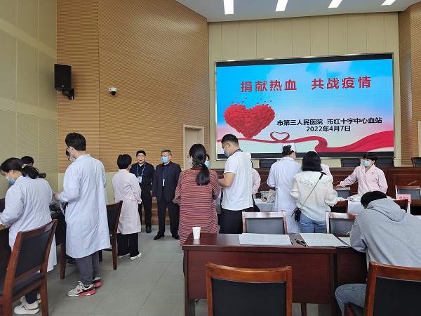 市紅十字中心血站副站長王永紅帶領(lǐng)工作人員在市三院大會議廳設(shè)置臨時獻血點,醫(yī)院干部職工踴躍參,用實際行動踐行初心使命,助力疫情防控戰(zhàn)役。市三院黨委書記、院長唐達亮,分管領(lǐng)導(dǎo)王正馬第一時間來到獻血現(xiàn)場鼓勵全院干部職工。經(jīng)體檢合格后,我院有34名職工完成獻血,累計獻血量達7900毫升,另有10多名同志因夜班、生理期等原因,準備近期到市中心血站獻血。
