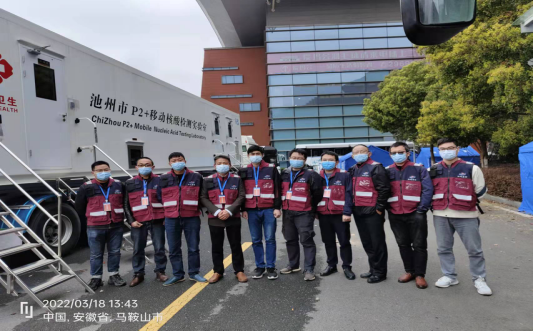 我們的工作地點(diǎn)在馬鞍山市會(huì)展中心廣場(chǎng),放眼望去,這里已停了十來(lái)輛來(lái)自省內(nèi)其他市縣的支援檢測(cè)車輛和旁邊搭起的臨時(shí)帳篷,一切顯得緊張有序。這次池州共派出8名檢驗(yàn)人員,分別來(lái)自市疾控中心、市立醫(yī)院、市二院、市中醫(yī)院等醫(yī)療機(jī)構(gòu)。我們這支隊(duì)伍還有幾位同志是從支援安慶結(jié)束后短暫休整了一夜又匆匆趕過(guò)來(lái)的,感覺疫情期間所有的醫(yī)務(wù)人員都不容易??!當(dāng)天下午我們就上了檢測(cè)車熟悉儀器和操作流程,邊學(xué)邊干、邊干邊學(xué),待到晚飯時(shí)間一出檢測(cè)艙,脫下防護(hù)服,摘下N95口罩后,感覺呼吸好輕松,好舒服。也實(shí)實(shí)在在體會(huì)到了嚴(yán)格防護(hù)下身體的難受,悶熱、呼吸累、口罩勒得人臉頰疼等。