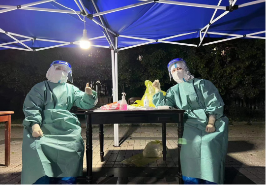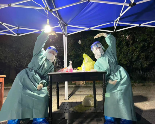 4月9日10時左右,接到通知再次出征上海,16時左右到達上海嘉定區(qū),分組行動,社區(qū)工作人員們及志愿者們井然有序的維持著秩序、信息掃描,我們不斷重復著“請摘下口罩…張嘴…頭后仰~”就這樣不知不覺就到了凌晨,忍著口干舌燥,忍著口罩系帶給耳朵帶來的疼痛,在一聲聲“謝謝”“辛苦了~”的話語中都沖散了,心里還是很溫暖……