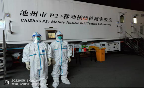 3月15日當天到達現(xiàn)場后,我們草草結(jié)束中飯,隨即立刻穿上防護服,進入實驗艙進行檢測任務(wù)。由于本單位還沒開展核酸檢測這一項目,我們抱著學(xué)習的態(tài)度,跟著隊友熟悉儀器的操作和檢測的流程。傍晚與另外一組隊員交接班時,不透氣的防護服、厚厚的N95口罩、滿是水霧的防護面屏,讓我第一次真正體會到一線抗擊疫情人員的不易。在現(xiàn)場匆匆忙忙的吃了口晚飯,我和同事立即趕往安排的賓館,整理好行李后稍作休息,這時接到出發(fā)去現(xiàn)場的指令,于是我們又馬不停蹄地趕到檢測車上,開始核酸檢測的工作。
