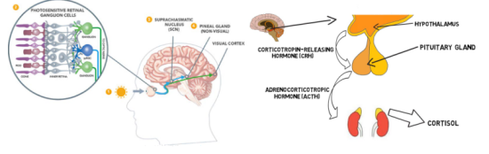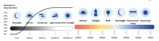 第三類感光細(xì)胞 ipRGC 直接與控制我們晝夜節(jié)律和生物鐘的大腦部分進(jìn)行交流,這種受體影響睡眠激素(褪黑激素)和壓力激素(皮質(zhì)醇)的分泌。當(dāng)光照水平較低且在黑暗中(夜間),褪黑激素的產(chǎn)生會增加,而當(dāng)光照水平較高(白天)時,皮質(zhì)醇的產(chǎn)生會增加。光線太少會使我們感到沮喪,尤其是在冬季(SAD–季節(jié)性情感障礙)。光照會影響我們健康的諸多方面:從我們的情緒、睡眠到我們的視覺、聽覺感知等。