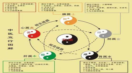 中醫(yī)認(rèn)為,天地是個大宇宙,人體是個小宇宙,天與人是相通的。同時,人的五臟(脾、肺、肝、心、腎),和五志(思、憂、怒、喜、恐五種情緒反應(yīng))及五音(宮、商、角、徵、羽五種中國調(diào)式音樂),都存在著一一對應(yīng)和相生相克的關(guān)系。如圖: