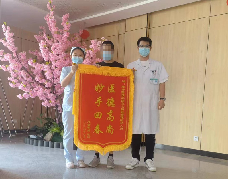 7月25日上午,患者劉某家屬將印有“醫(yī)德高尚 妙手回春”的錦旗,鄭重地送到七病區(qū)醫(yī)護(hù)人員手中。