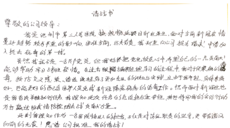“我深知此次任務(wù)的危險性與嚴(yán)重性,我將用實際行動為打贏這場防控阻擊戰(zhàn)貢獻(xiàn)力量……”這句話摘自我司保潔主管汪榮生的《請戰(zhàn)書》。