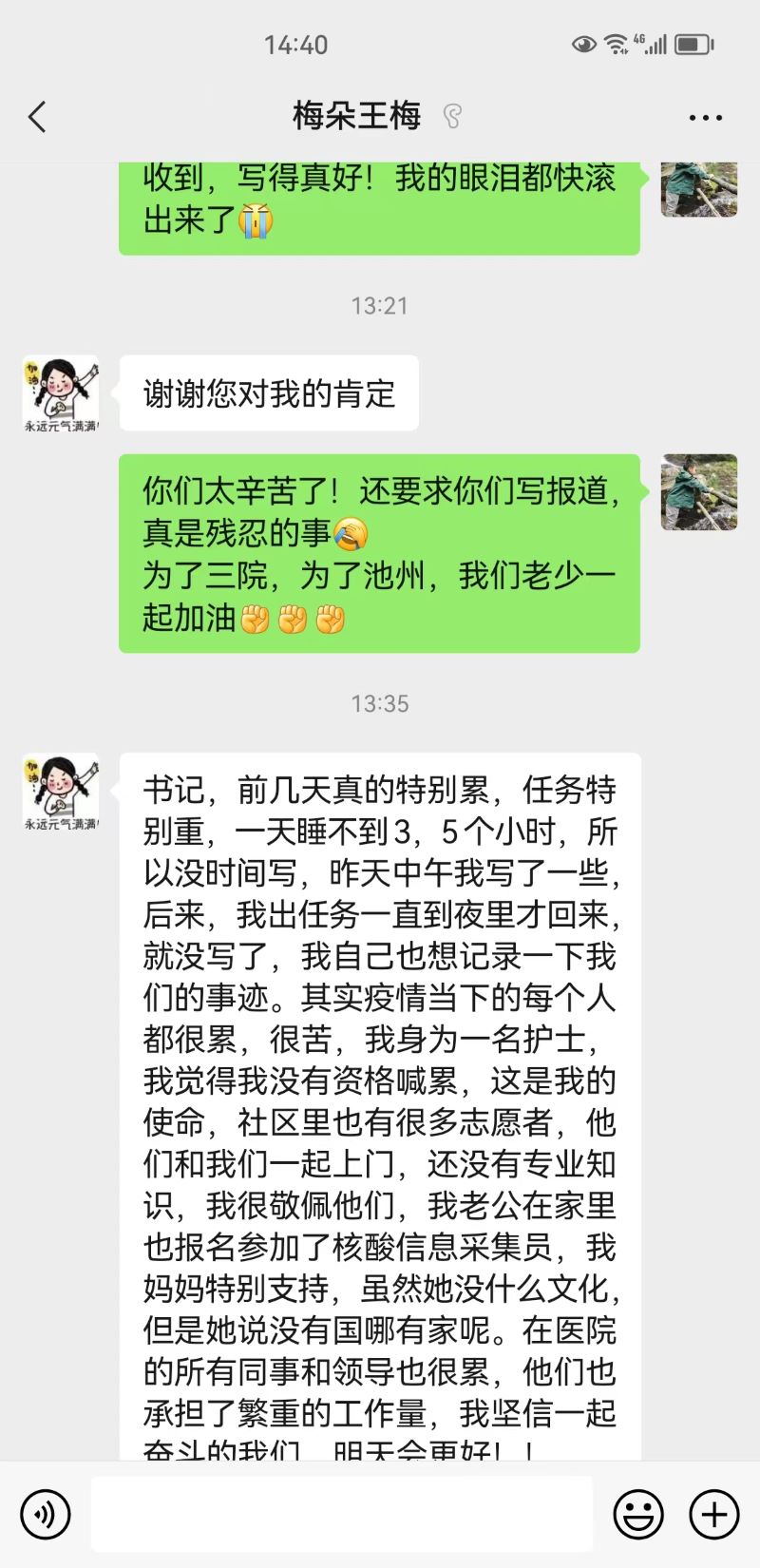 五天的戰(zhàn)疫沒有因為突然而來的大雨、降溫以及那些不理解帶來的委屈而退卻,相反,那些素不相識的人在我們疲備時送上的食物、極配合而真誠說出的感謝之語都溫暖了我的心,看著身邊的聽到任務(wù)立刻昂揚斗志的同事們,我更加堅定了戰(zhàn)疫到最后一天的決心,不勝不歸,不然又怎么對得起我時時牽掛的寶寶和全城人的期待。我相信,在全城人的團結(jié)抗疫下,這疫情定會被這大雨沖刷帶走,雨后又是晴朗祥和、滿城煙火氣息的池城。