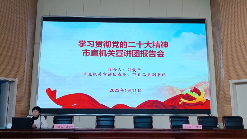 1月11日下午,學(xué)習(xí)貫徹黨的二十大精神市直機(jī)關(guān)宣講團(tuán)到市三院宣講,市直機(jī)關(guān)宣講團(tuán)成員、市直工委副書(shū)記劉愛(ài)平作宣講報(bào)告,院黨委專職副書(shū)記、紀(jì)委書(shū)記王華偉主持會(huì)議,在院黨政班子成員、全體黨員參加宣講會(huì)。