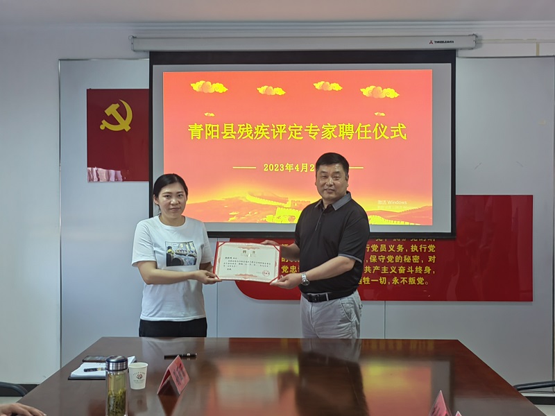 青陽縣殘聯(lián)理事長蘇文彥為市三院醫(yī)務(wù)人員代表授予了殘疾鑒定委員會專家?guī)斐蓡T聘書。