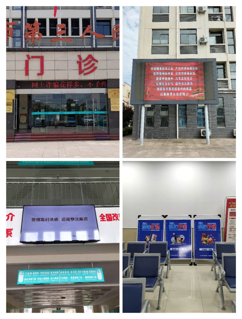 在門急診大廳、住院部、候診大廳等集中區(qū)域和醒目位置設(shè)置反詐防騙宣傳海報(bào)、展板和警示牌,電子顯示屏滾動播放反詐防騙宣傳標(biāo)語和反詐短片,網(wǎng)站和微信公眾號、抖音等新媒體平臺常態(tài)化推送反詐信息,加強(qiáng)反詐宣傳。