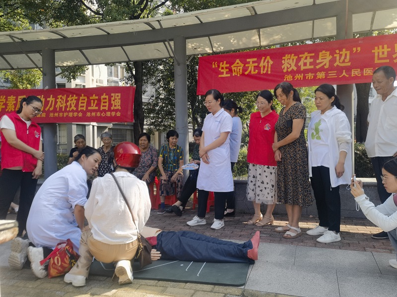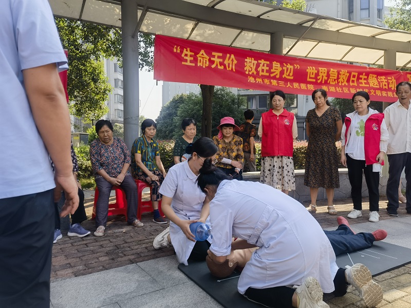 為深入學(xué)習(xí)貫徹習(xí)近平新時(shí)代中國(guó)特色社會(huì)主義思想,踐行“人民至上,生命至上”理念,9月8日,在第24個(gè)“世界急救日”即將到來(lái)之際。池州市第三人民醫(yī)院赴南湖社區(qū)舉辦“生命無(wú)價(jià),救在身邊”主題宣傳活動(dòng)。