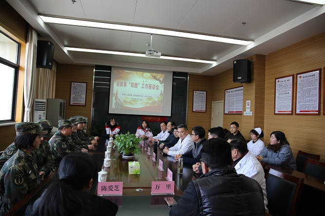 1月17日下午,市三院召開迎新春“雙擁”工作座談會,駐池某部衛(wèi)生隊現(xiàn)役軍人,市三院在職退伍、轉(zhuǎn)業(yè)軍人及軍屬,醫(yī)院領(lǐng)導(dǎo)班子成員共19人參加會議,軍地雙方歡聚一堂,共敘軍民魚水情。院黨委書記、院長唐達亮主持會議并講話。