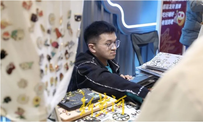 熙熙攘攘的文創(chuàng)市集上牛傳磊瘦小的身影被隱藏在攤位里桌面上的金屬徽章反射著燈光不起眼的小攤便不再黯淡。