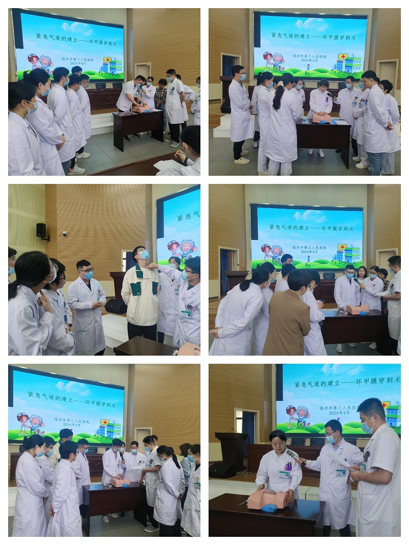 培訓(xùn)現(xiàn)場(chǎng),陳小勇主任詳細(xì)講解了環(huán)甲膜穿刺術(shù)的適應(yīng)癥、用物準(zhǔn)備、操作流程及注意事項(xiàng)等內(nèi)容,并現(xiàn)場(chǎng)演示了環(huán)甲膜穿刺術(shù)的操作步驟,使大家對(duì)該項(xiàng)技術(shù)有了全面深入的了解。同時(shí),他強(qiáng)調(diào)在緊急情況下,環(huán)甲膜穿刺術(shù)是搶救患者生命的重要手段,醫(yī)務(wù)人員必須熟練掌握此技術(shù),以便在關(guān)鍵時(shí)刻為患者急救工作贏得寶貴的時(shí)間。
