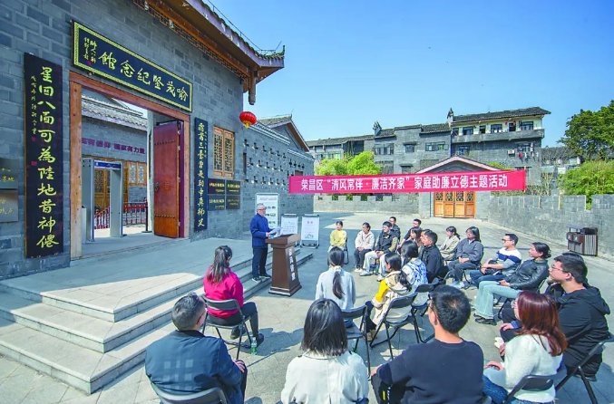 重慶市榮昌區(qū)紀(jì)委監(jiān)委聯(lián)合區(qū)婦聯(lián)等單位開展“清風(fēng)常伴·廉潔齊家”家庭助廉立德主題活動,教育引導(dǎo)黨員干部注重家庭家教家風(fēng)建設(shè)。圖為近日,講解員在喻茂堅紀(jì)念館門前為黨員干部及其家屬講述喻氏家族清廉家風(fēng)故事。張春連 攝