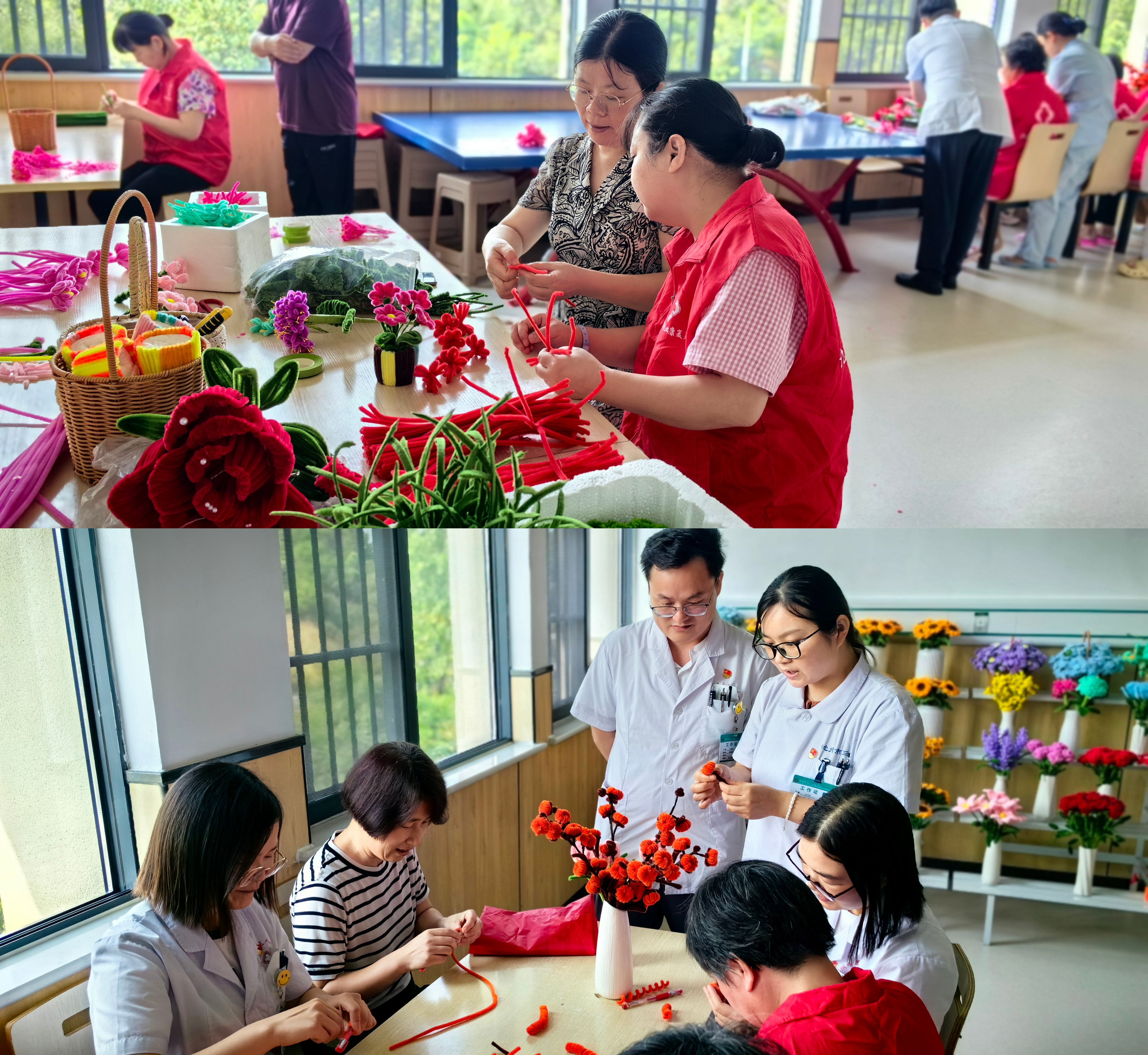 活動通過制作扭扭棒手工花卉的形式開展,扭扭棒是由鐵絲和絨毛組成的一種手工材料,是當下頗為流行的小手工?;顒蝇F場,黨員護士結合實物為大家詳細講解扭扭花的制作方法和技巧,大家積極主動,將一根根小小的扭扭棒扭一扭、剪一剪、繞一繞,場面熱鬧非凡。不一會兒,一朵朵精美的花卉在指尖悄然“綻放”,笑意在嘴角“流動”。大家將制作完成的扭扭花互相贈送,傳遞著感恩與美好。