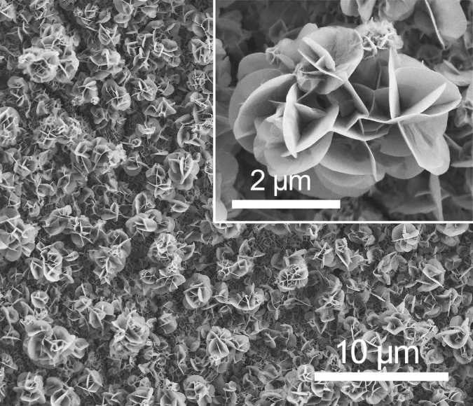 孫立成介紹,此次研究純屬偶然。一次,團(tuán)隊(duì)成員在利用浸泡法制備鎳鐵基OER催化劑時(shí),把乙醇(酒精)當(dāng)作去離子水使用,結(jié)果發(fā)現(xiàn)在泡沫鎳上長出來的催化劑OER性能非常不錯(cuò)。在電鏡視角下,這一催化劑如同花朵般層層疊疊,因此被命名為“繡球花”。