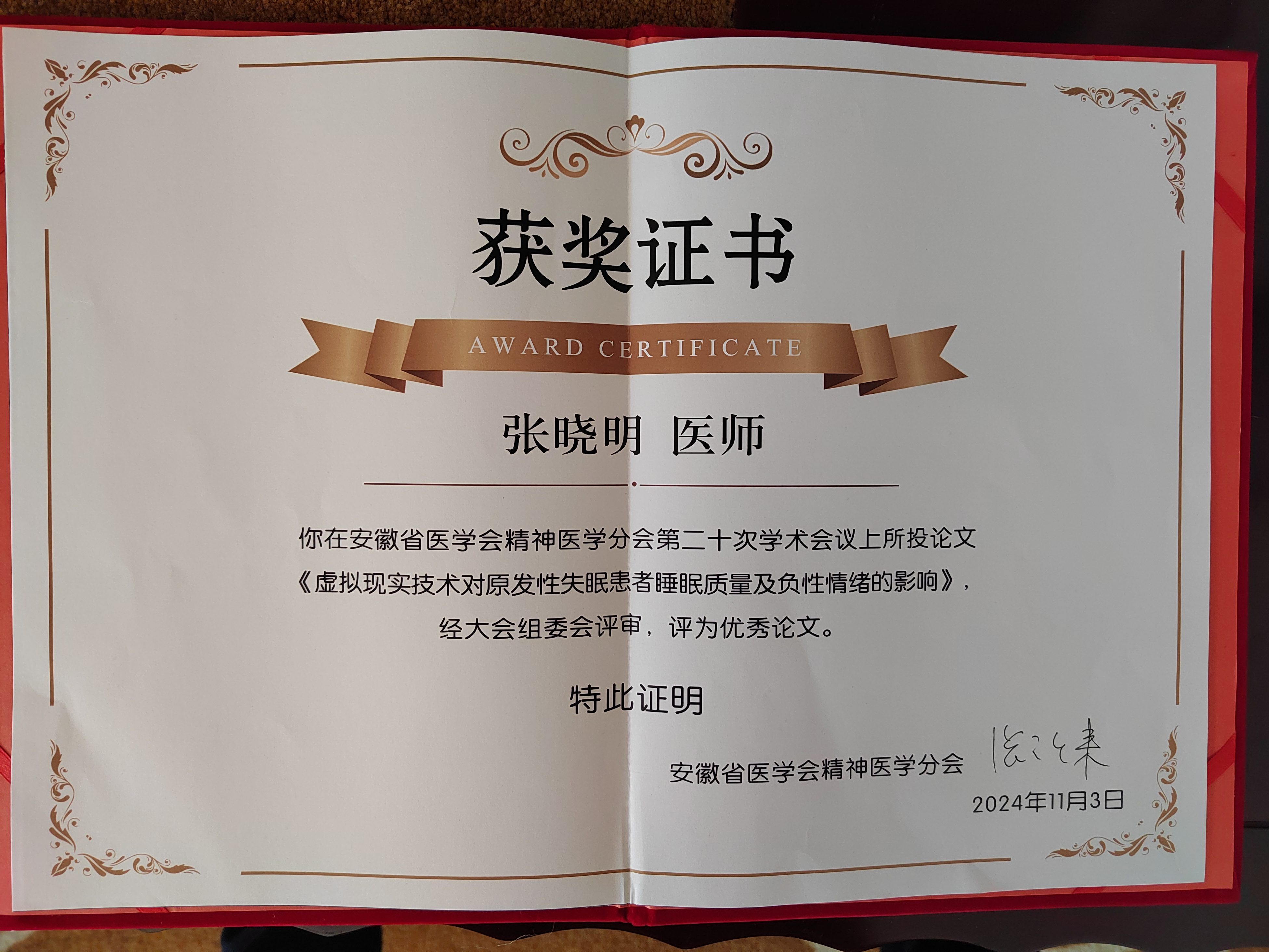 近日,由省醫(yī)學(xué)會、省醫(yī)學(xué)會精神醫(yī)學(xué)分會主辦,安慶市第六人民醫(yī)院承辦的“安徽省醫(yī)學(xué)會精神醫(yī)學(xué)分會第二十次學(xué)術(shù)年會”在安慶市召開,市三院副院長、副主任醫(yī)師張曉明的論文《虛擬現(xiàn)實技術(shù)對原發(fā)性失眠患者睡眠質(zhì)量及負(fù)性情緒的影響》成功入選安徽省醫(yī)學(xué)會精神醫(yī)學(xué)分會第二十次學(xué)術(shù)年會的論文交流環(huán)節(jié)。