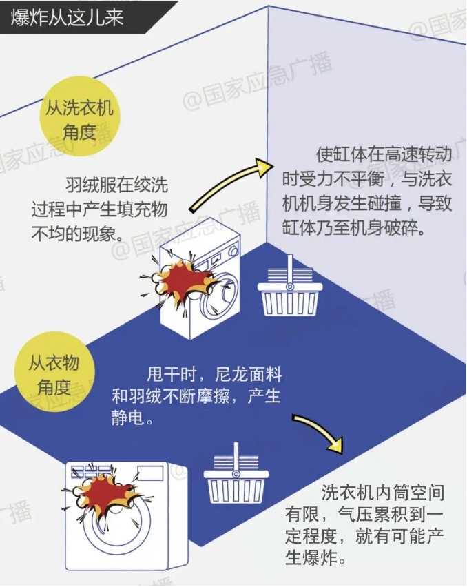 清洗羽絨服時,浸濕的羽絨會聚集成團,導(dǎo)致羽絨服內(nèi)產(chǎn)生大面積空隙。高速甩干時,吸飽水的羽絨不斷膨脹,羽絨服內(nèi)空氣受到擠壓,而防水涂層又阻礙了氣體排出,可能會使羽絨服不斷被撐大,甚至將洗衣機內(nèi)筒撐滿,引發(fā)爆炸。