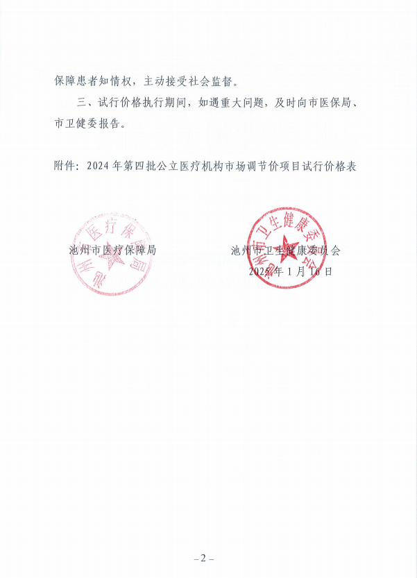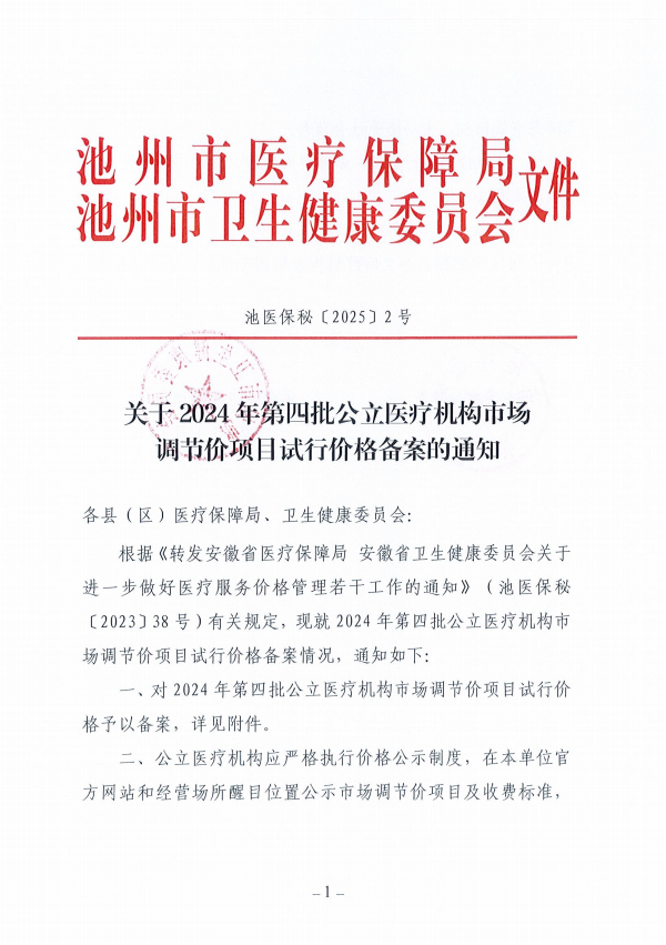 根據(jù)池州市醫(yī)療保障局、池州市衛(wèi)生健康委員會(huì)《關(guān)于2024年第四批公立醫(yī)療機(jī)構(gòu)市場(chǎng)調(diào)節(jié)價(jià)項(xiàng)目試行價(jià)格備案的通知》要求,我院新增1項(xiàng)醫(yī)療服務(wù)價(jià)格,公示如下。