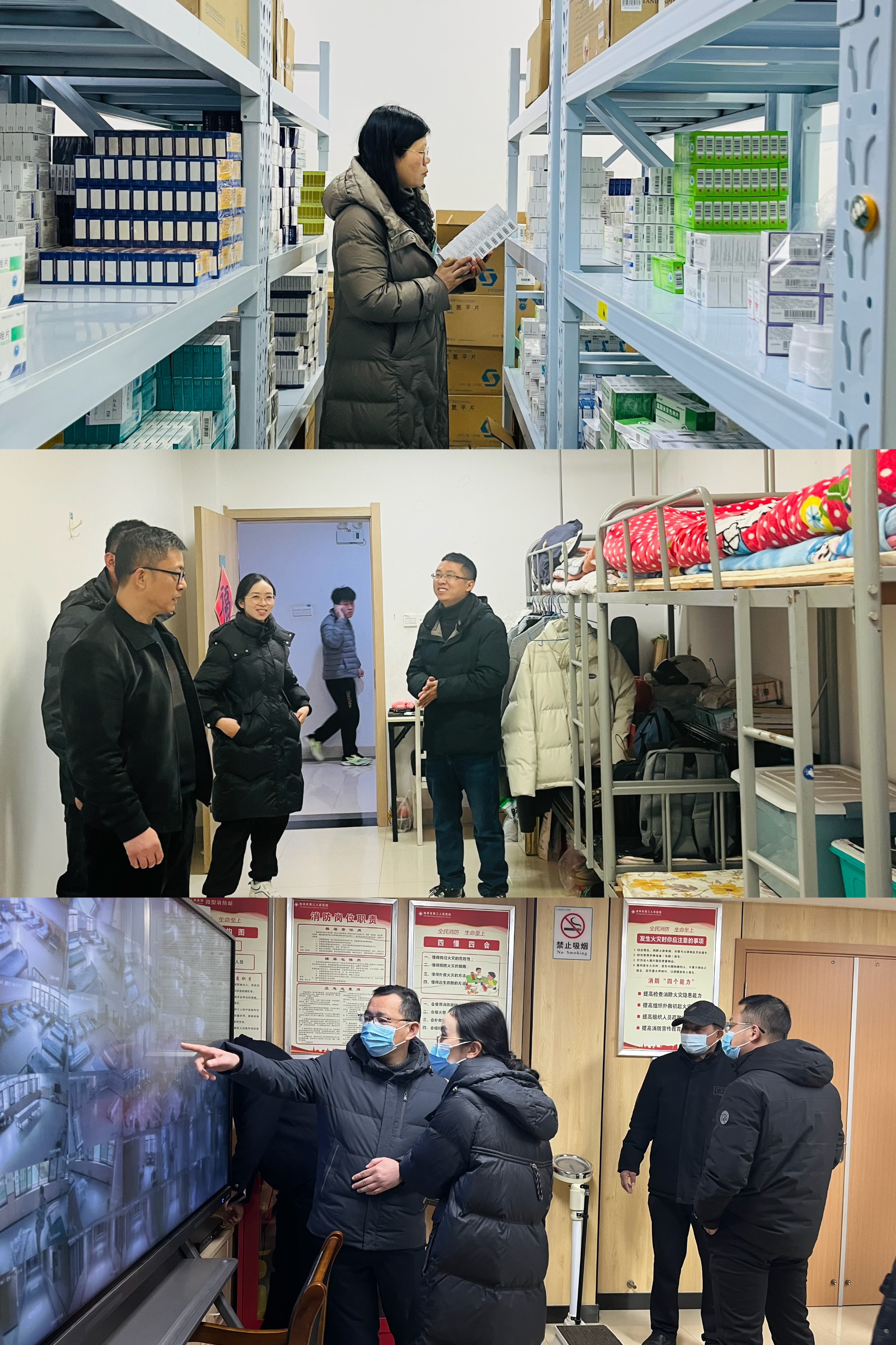 檢查組依次深入住院病區(qū)、影像樓、消控室、食堂、門診各科室以及職工宿舍等重點區(qū)域,進行“拉網(wǎng)式”排查。重點聚焦用火用電用氣安全、值班巡查記錄規(guī)范性、安全設(shè)備配備與運行狀態(tài)等方面進行了嚴(yán)格檢查,并實地測試一鍵報警系統(tǒng)的運行情況。每到一處,檢查組詳細了解各病區(qū)節(jié)日值班值守以及藥品、耗材、急救設(shè)備等應(yīng)急物資儲備情況,針對發(fā)現(xiàn)的問題隱患,現(xiàn)場反饋、現(xiàn)場交辦。