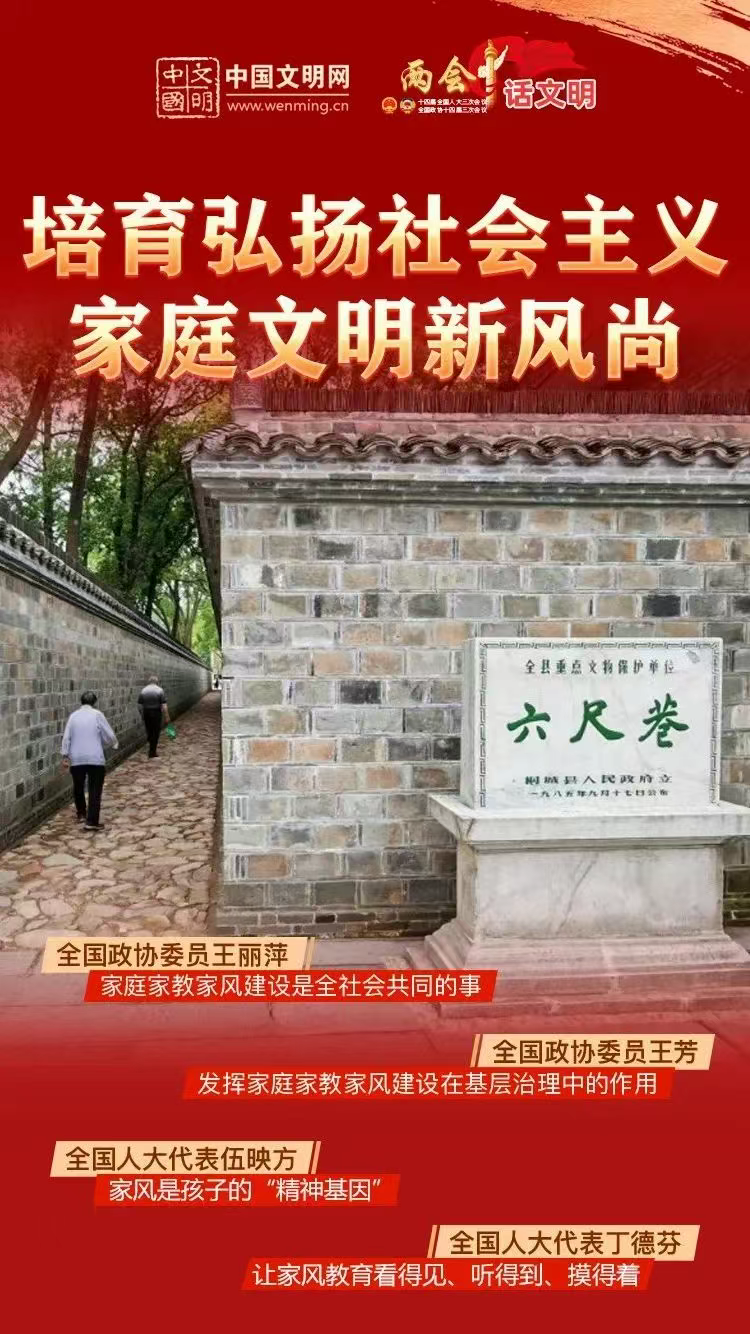 家風(fēng)是孩子的“精神基因”,也是塑造品格的根基。父母以身作則的孝善、勤儉,勝過千言說教,讓孩子在朝夕相處中自然習(xí)得責(zé)任感與道德判斷力,同時(shí)能獲得家族的歸屬感、榮譽(yù)感,從而在人生的道路上知敬畏、懂規(guī)矩。家風(fēng)家教對(duì)營造和諧穩(wěn)定的社會(huì)氛圍有著不可替代的作用。讓年輕一代感悟中華優(yōu)秀傳統(tǒng)文化中的家風(fēng)內(nèi)涵,從生活場(chǎng)景中尋找切入點(diǎn),日常談家訓(xùn)、節(jié)日傳習(xí)俗,讓優(yōu)良的家規(guī)家書、祠堂的匾額故事成為年輕人文化記憶的一部分。
