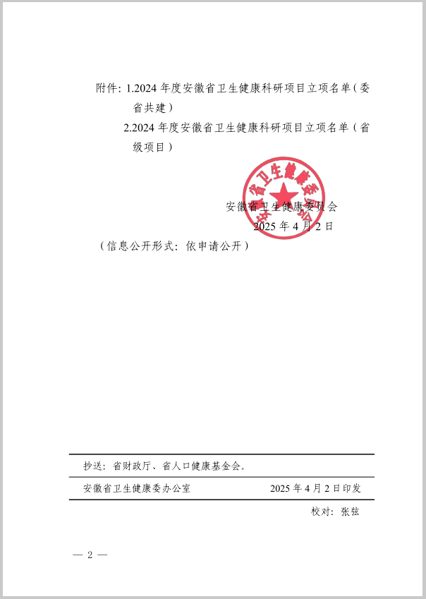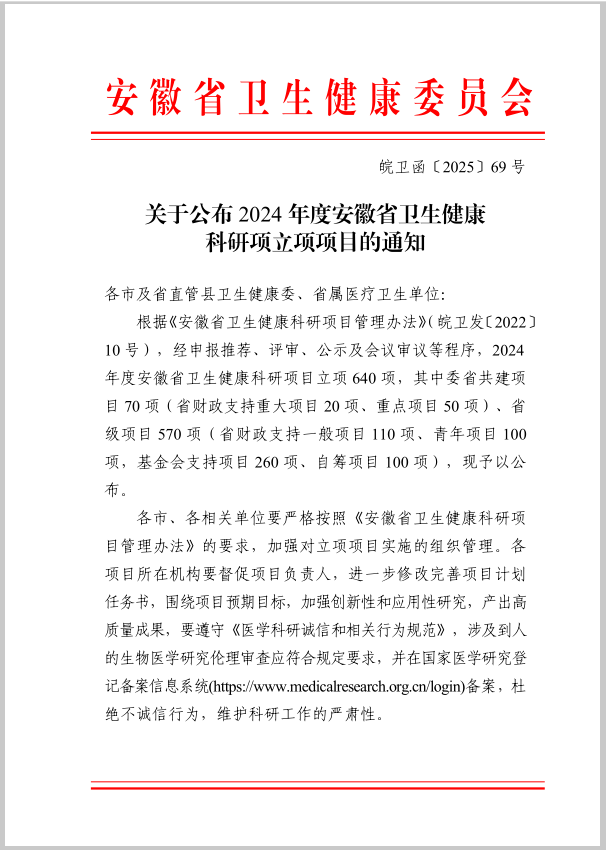 【喜報(bào)】我院又一項(xiàng)科研項(xiàng)目獲安徽省衛(wèi)生健康委科研立項(xiàng)